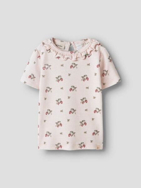 Produkttype: Topp Hals: Rund hals Erme: Korte ermer Lukking: Knapp- og hempelukking Ekstra detaljer: Babylock-detalj, rysjer, merkelapp Trykk: Trykk gjentas over hele produktets overflate Passform: Slim fit