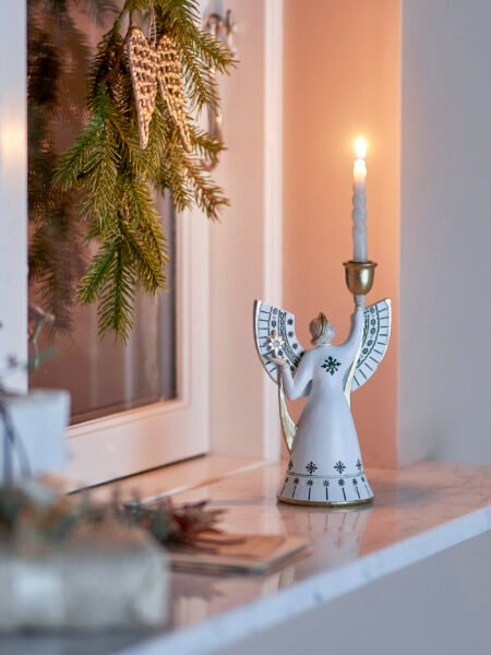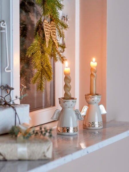 kr 329,00Faella Votive & Candle Holder fra Bloomingville er et sett med to elegante lysestaker formet som engler. Laget av hvitt steintøy og dekorert med fine gulldetaljer på glorien og det vakre mønsteret på kjolen, er de perfekte for å skape en varm og festlig atmosfære på julebordet eller som en del av et dekorativt oppsett i hjemmet.Passer til både kronelys og t-lys.Mål: D11xH12 cm, sett med 2 stkKomposisjon: 100 % steintøyKronelysets diameter cm. Ø 2,2 cm/Telys Ø4xH2 cm