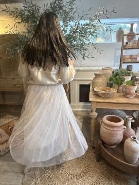 tyllsjørtet har strikk i livet og er foret et stykke ned på innsiden.