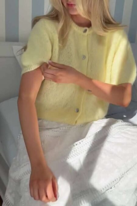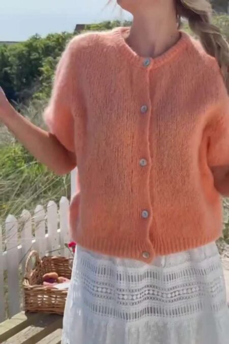 Jakken har rund hals og lukkes med fine knapper langs fronten.