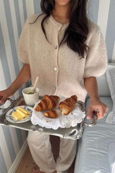 Bolen er utsmykket med kabelstrikkede detaljer,
