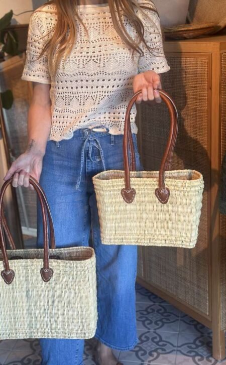 kr 699,00Oppdag den perfekte blandingen av tradisjon og moderne stil med vår håndvevde raffia-veske med fargerike blomsterdetaljer. Laget av naturlig raffia og utsmykket med livlige blomsterdetaljer, er denne vesken ideell for strandturer og markedsturer. En vakkert håndlaget veske for enhver anledning. Håndvevd raffia-veske med blomsterdesign – Allsidig veske – Marokkansk håndverk Enten du trenger en elegant sommerveske, en unik hverdagsveske eller en omtenksom gave, er denne håndvevde raffia-vesken et utmerket valg! Mange kunder bruker også disse veskene til stilig oppbevaring eller dekorative detaljer i hjemmene sine. Den er solid og slitesterk, og beholder formen i årevis. Vesken din kan ankomme litt misformet på grunn av frakt. For å gjenopprette sin opprinnelige form, spray den lett med vann, form den om med hendene og la den stå i solen i noen minutter. Omtrentlige mål: Lengde: 45 cm Høyde: 27 cm Håndtakshøyde: 50 cm Detaljer Laget i Marokko Farge: Brun og flerfarget Materiale: Lær Anledningstema: Hverdag Sesong: Hele året