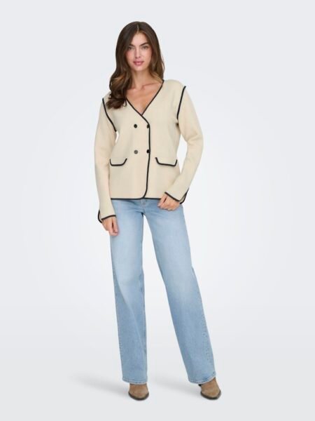 Jakken har rund hals og lukkes med fine knapper langs fronten.