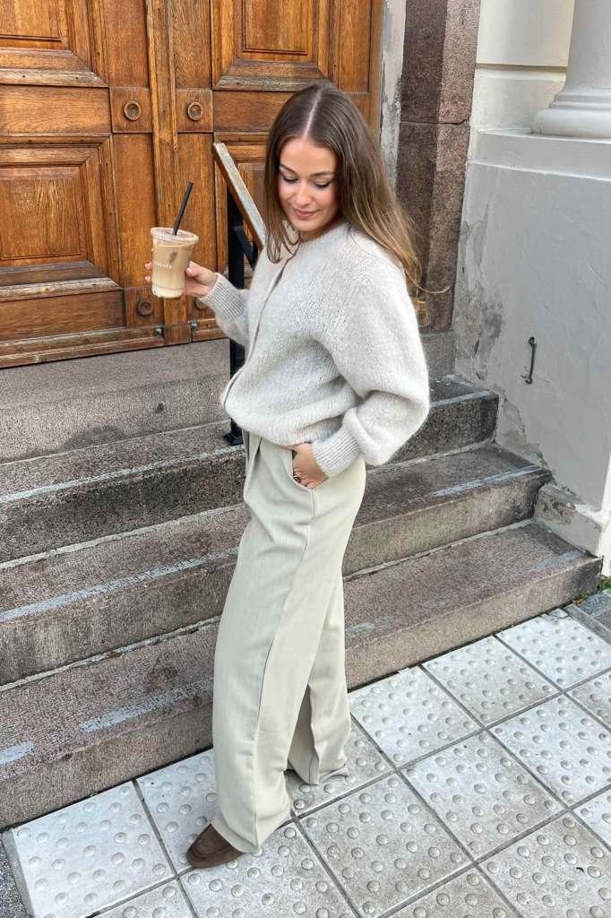 Cardiganen har lange ermer med brede, tettsittende ribbekanter som gir ermene et mykt puffet utseende.