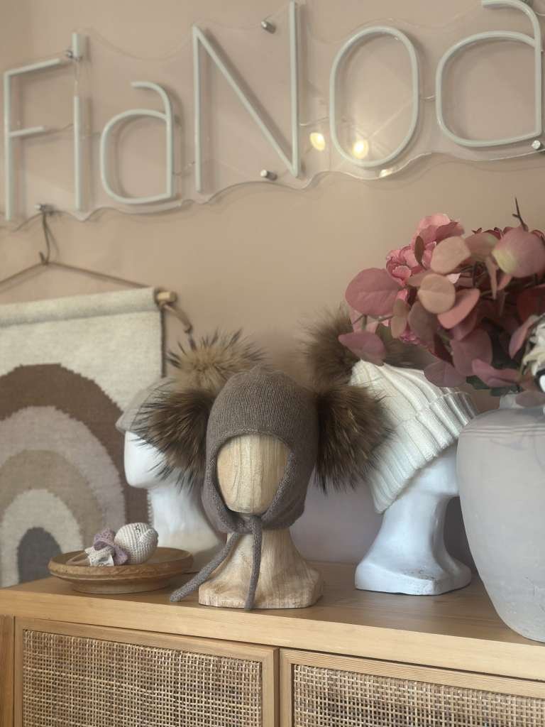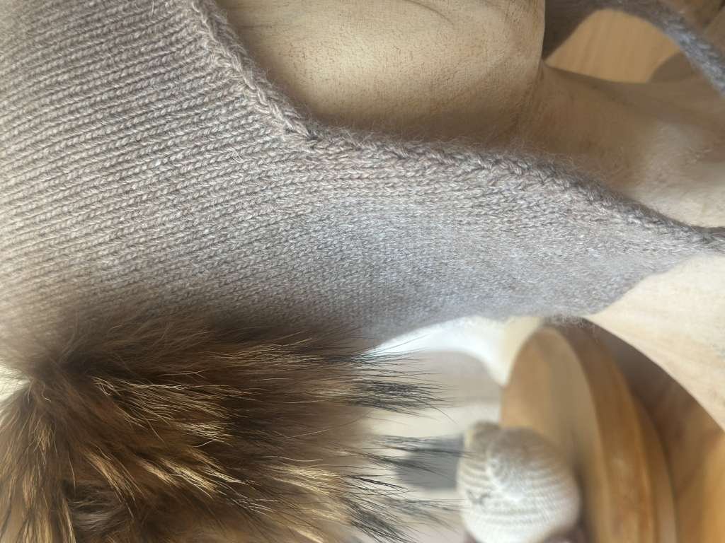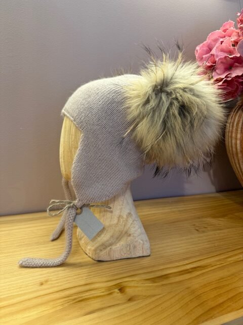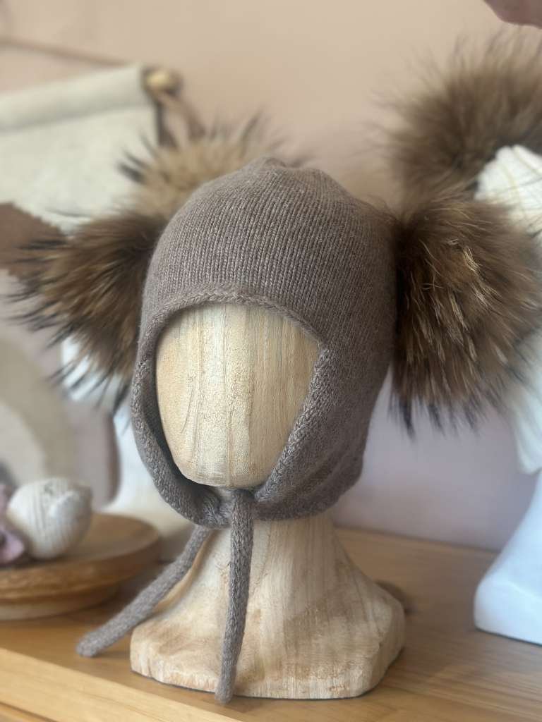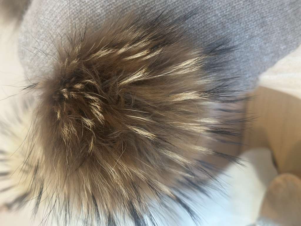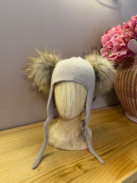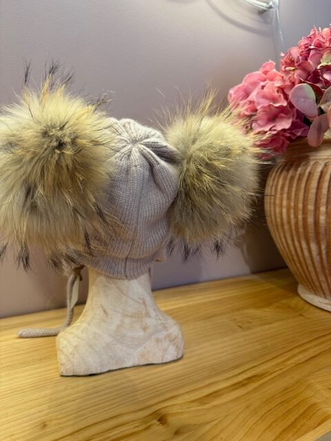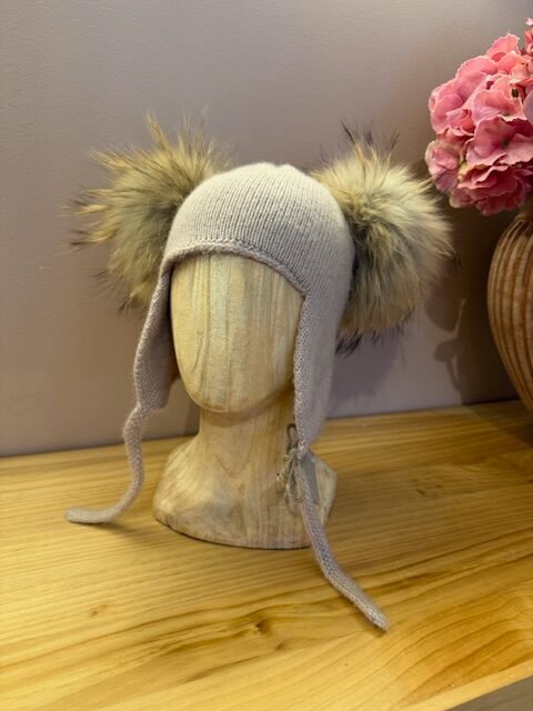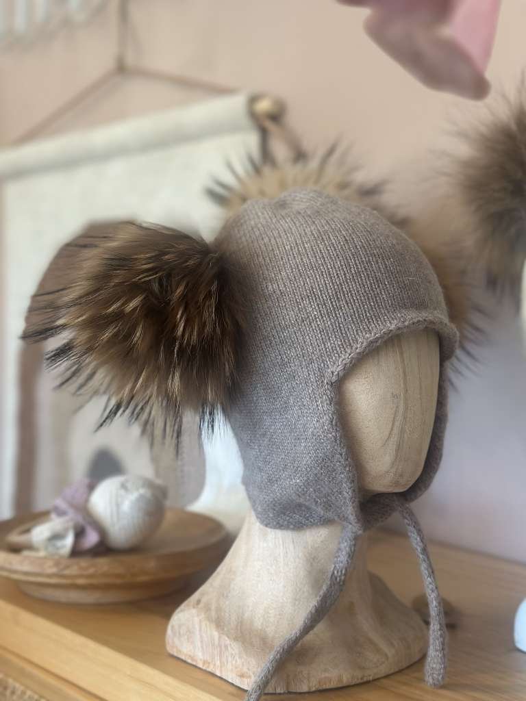 En fantastisk nydelig lue i kløfri chasmereblanding med to ekte pelsdusker