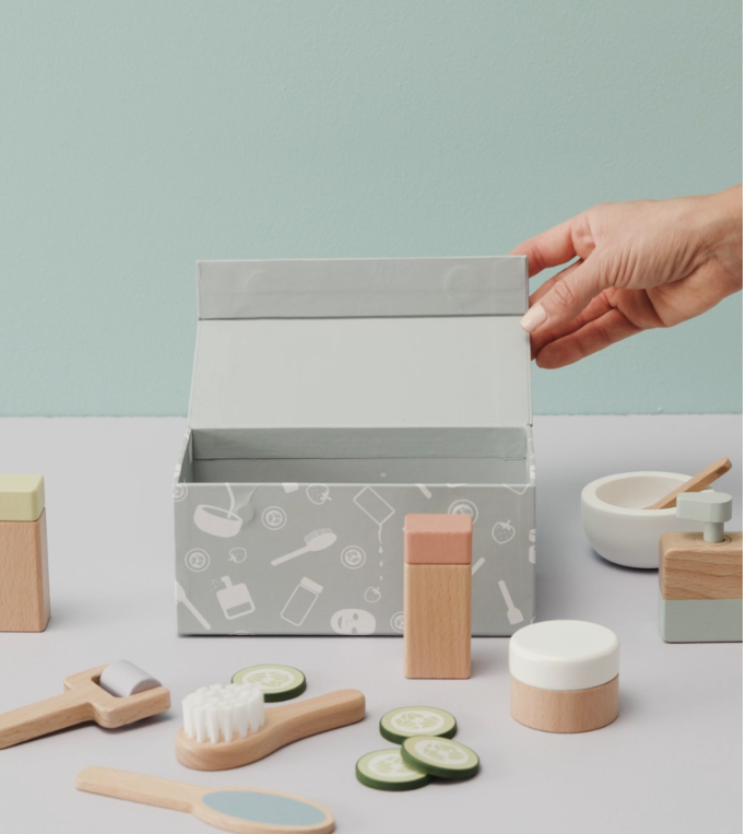 Bland, rull, slapp av! Hele familien kan nå få et koselig hjemmespa. Ja, noen ganger kan det være fint for både voksne og barn å koble av litt. Dette er et luksuriøst spa-sett for barn med alt du trenger for å slappe av og roe ned en stund. Pumpeflasken i tre har en liten innebygd fjær, så den føles som en ekte flaske når du pumper på den. I tillegg får du en miksebolle og en liten skje som passer utmerket for de som ønsker å blande sin egen kroppsskrubb eller maske. Og hva slags spa-dag ville det vært uten agurkskiver og en nydelig maske? Ansiktsmaskene er i samme materiale som en klassisk sheet-maske og finnes i tre forskjellige temaer – blåbær, honning og jordbær. Når du er ferdig med å spille, kan du enkelt pakke alt i vår matchende spa-boks med magnetisk lukking.