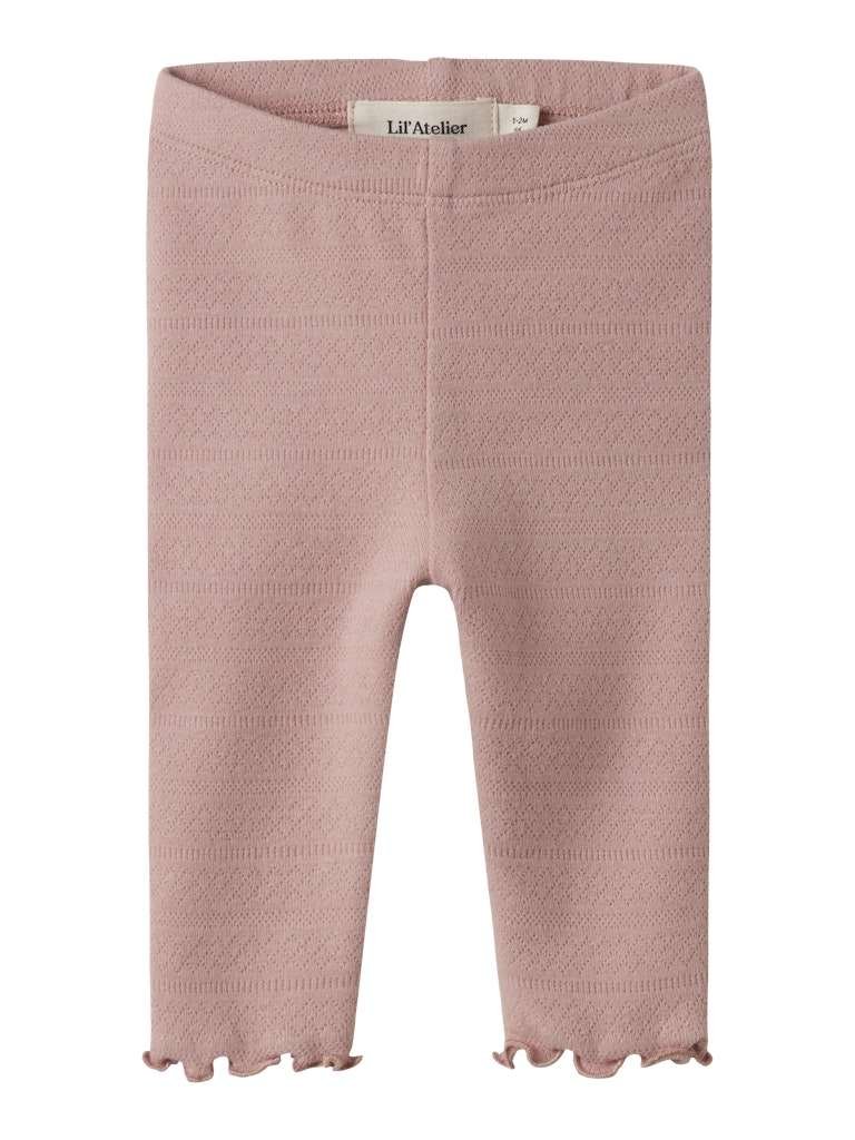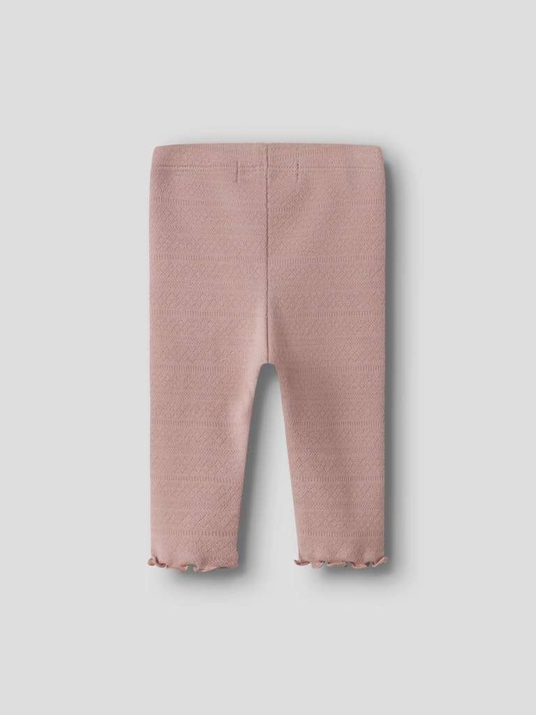 En søt og behagelig leggings/ bukse til babyen med fint hullmønster og bølgekant nederst på bena.