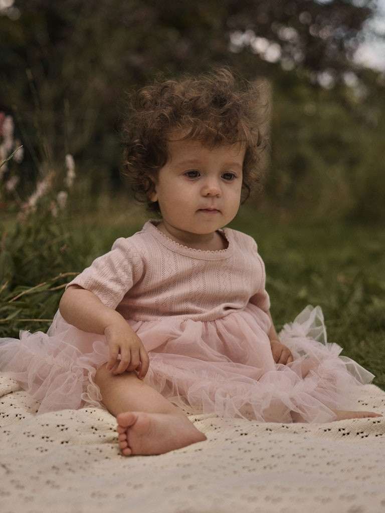 Supersøt kjole som er perfekte for enhver sesong og anledning. Laget i jersystoff som er lett og elastisk, med en myk overflate. Søt tyll på utsiden.