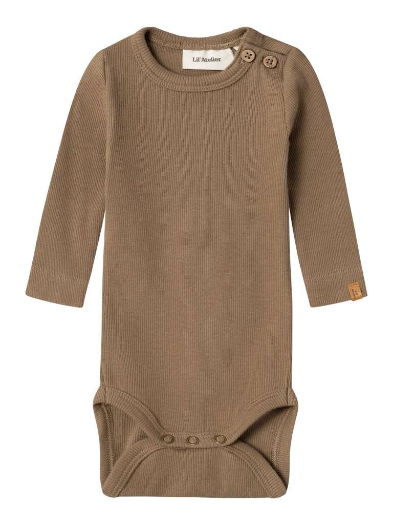 Fin, myk og komfortabel ribb body til baby i herlig brunfarge fra Lil’ Atelier.