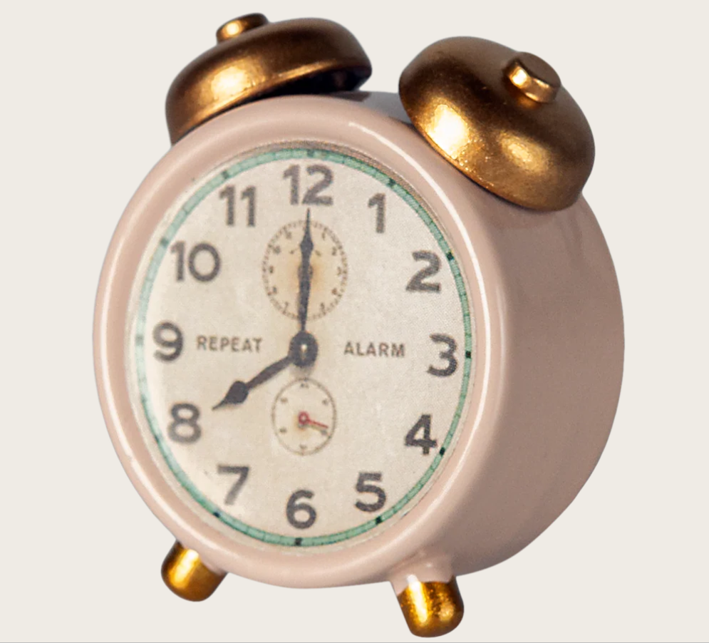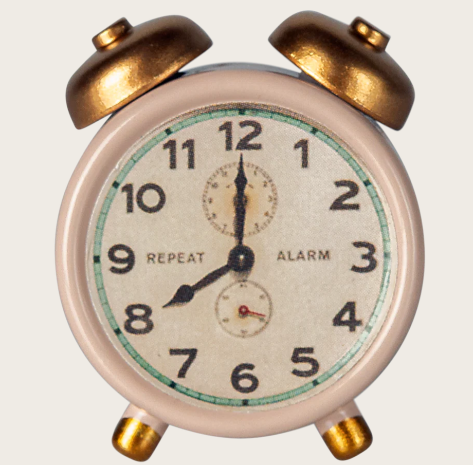 Den lille vekkerklokken er laget av metall og har mange små detaljer.