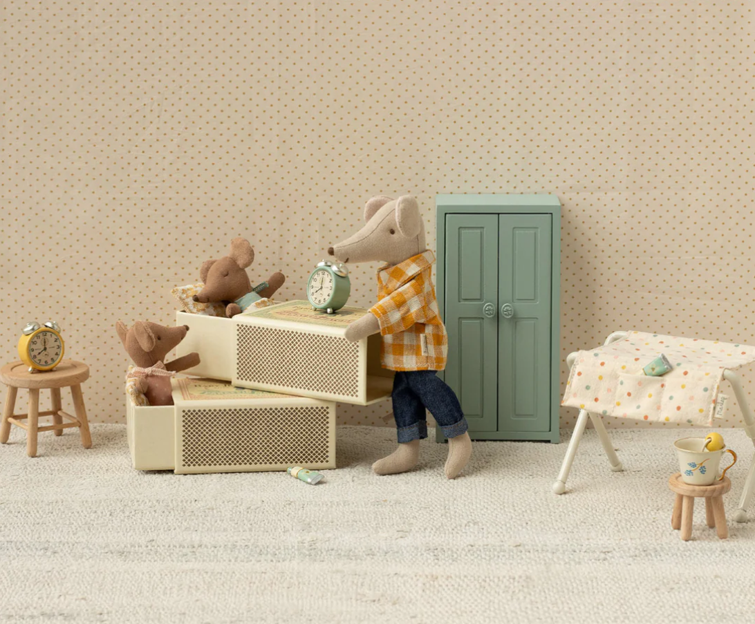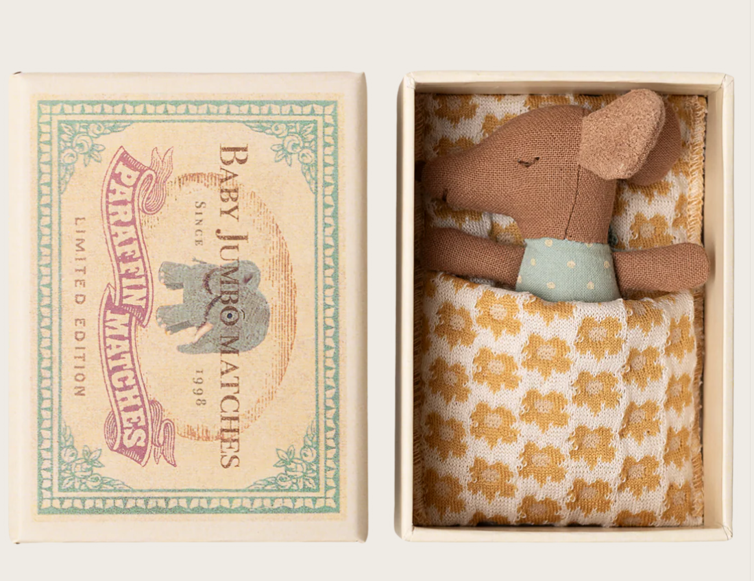 En Maileg-klassiker. Denne musen er klar for timevis med lek og sover trygt i den lille fyrstikkesken.