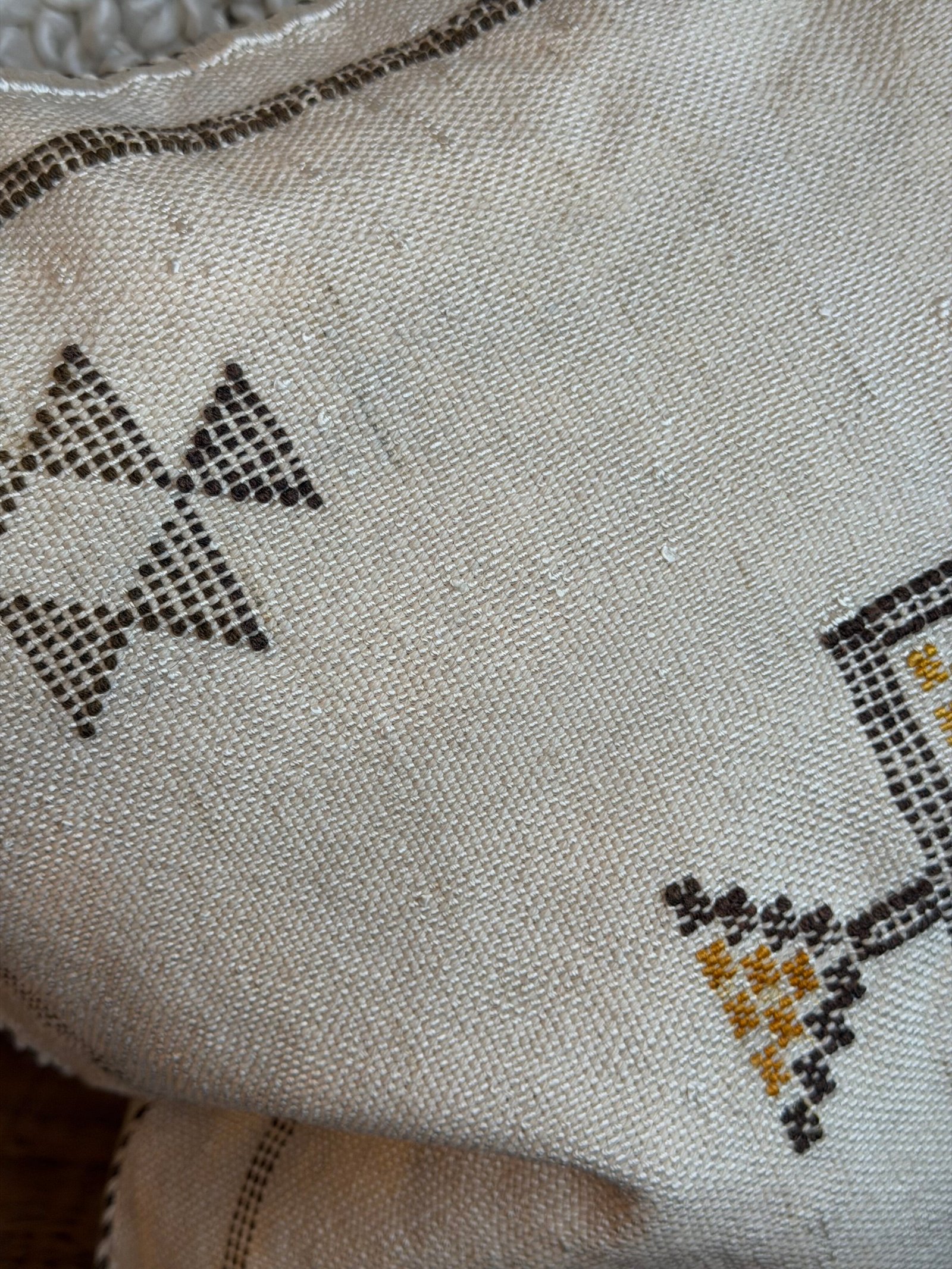Dette putetrekket er vevd av naturlige økologiske fibre fra agavekaktusen. Putene er plantefarget og fullstendig økologiske. Putetrekkene har ligget ute under Marokkos sol og » bleket for å få frem de fine fargene, Putene fremstår som unike, og det kan være at de ikke er feilfrie Og varierer noe i fargene. Det uperfekte er det perfekte.