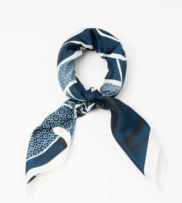 Dette elegante lille skjerfet har et moderne grafisk mønster i mørkeblått og hvitt, og er laget i myk polyester. Perfekt størrelse på ca. 70 x 70 cm. Bruk det som et stilfullt tilbehør til hverdags eller fest – rundt halsen, i håret eller på vesken.