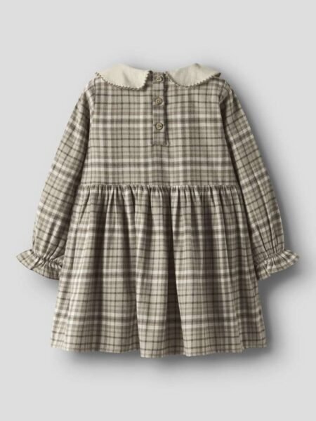 Kjolen har et klassisk rutemønster i varme bruntoner og en søt krage med broderte blomsterdetaljer –Med lange ermer, lett rynket liv og myke elastiske mansjetter får kjolen et romantisk og nostalgisk uttrykk.